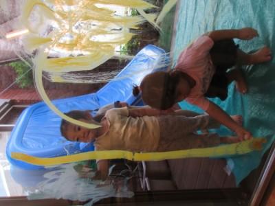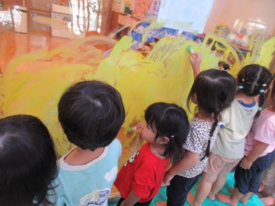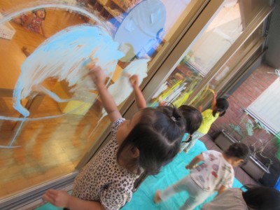 筆を使って描くことで指先の発達を促したり、大きな窓ガラスをキャンパスにすることでダイナミックに自分の描きたい気持ちを表現したりしながら、友達と楽しさを共有し夏ならではの遊びを楽しみました。