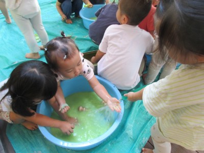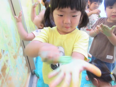 絵の具と水が混ざると「メロンジュースが出来たよ。」と、色の変化に気が付きながら遊んでいます。