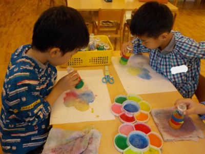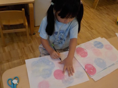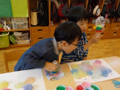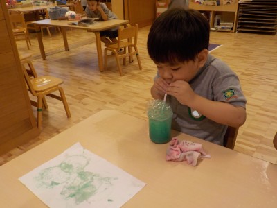 息を吹き込み出てきた泡を紙に乗せて遊びました。
