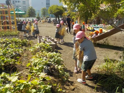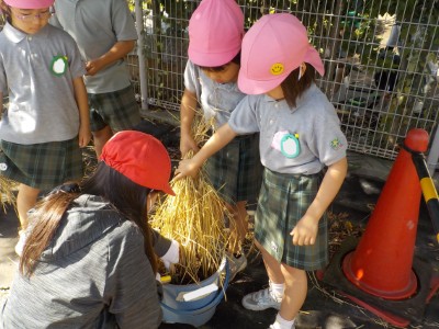 自分で植えたバケツ稲を友達と一緒に新城小学校まで持っていきました。