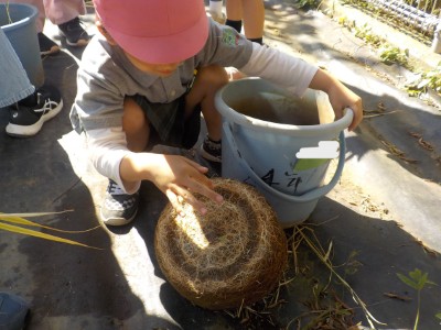 とびっしりと根っこが張り付いていることに気づき触って確かめていました。
