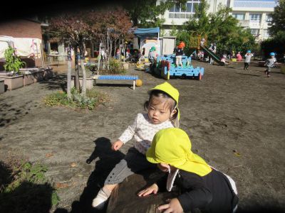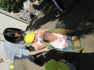 押す子も座っている子も笑顔になっていました。「なんだか楽しそう!」と一緒に同じ遊びをするなかで、楽しさが広がっています。