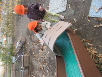 年上児がすべり台にお風呂マットをかぶせて、