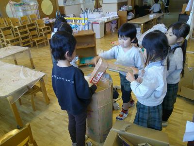が聞こえてきたので子ども達と一緒に段ボールで杵と臼を作る