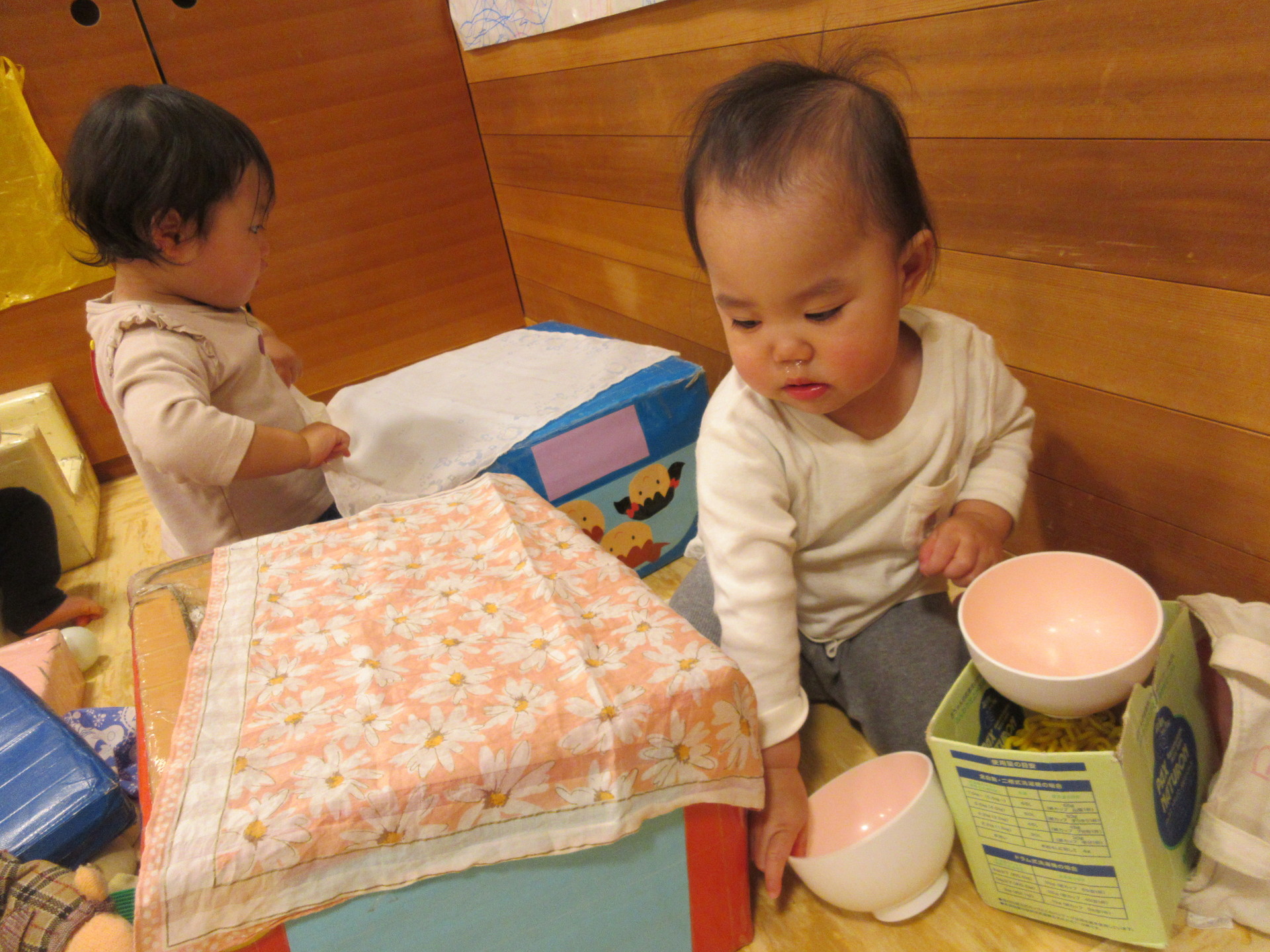 ひっくり返した箱の上に敷くとテーブルクロスのようになりました。この上にお皿やジュースを