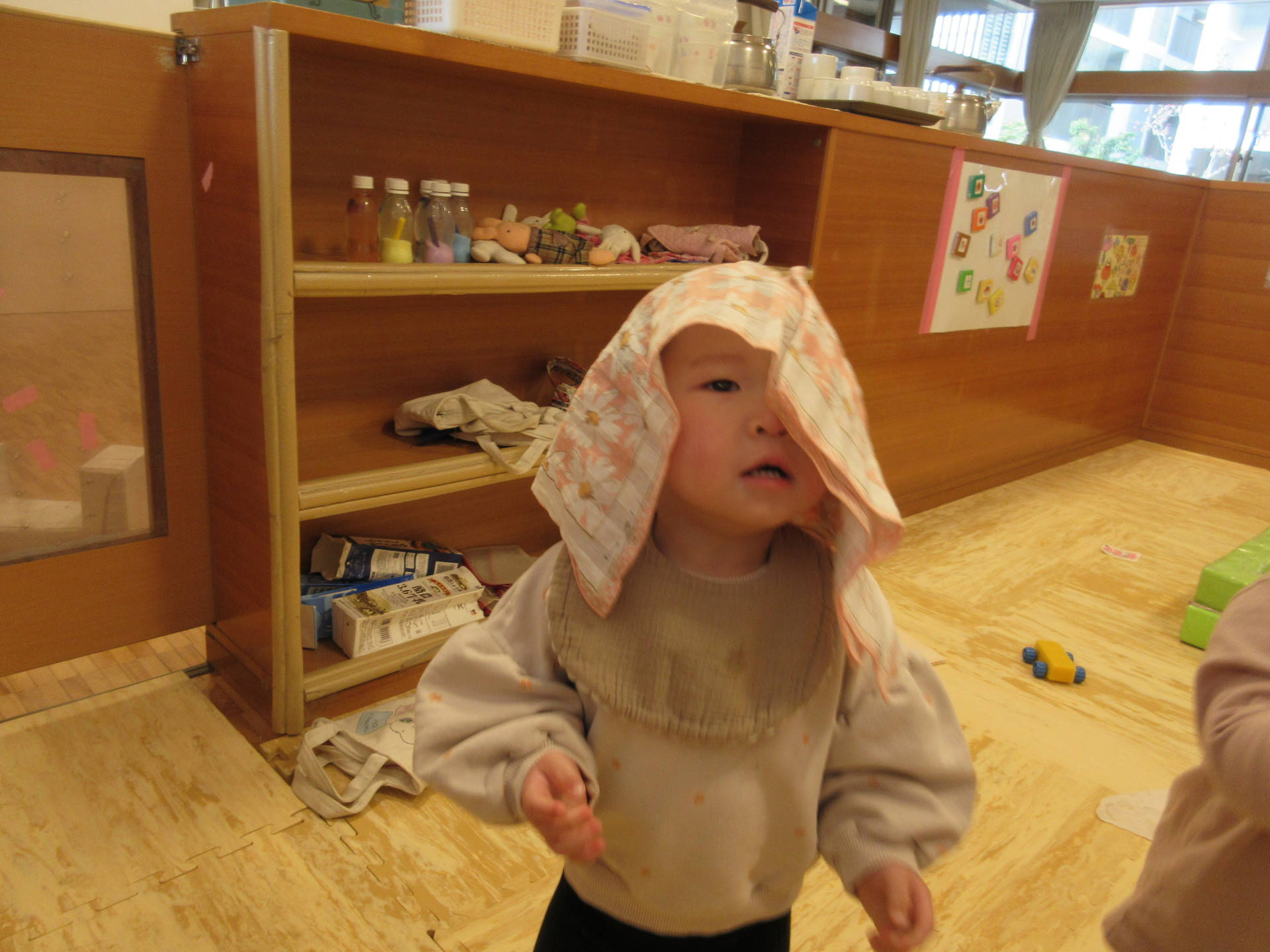 保育者にかけてもらっていたハンカチも、今は子ども達が頭にかけて歩いています。最近は、ハンカチをかけ、少し低い声を出しながらゆっくりと歩いていておばけのようなものを意識しているのかもしれません。