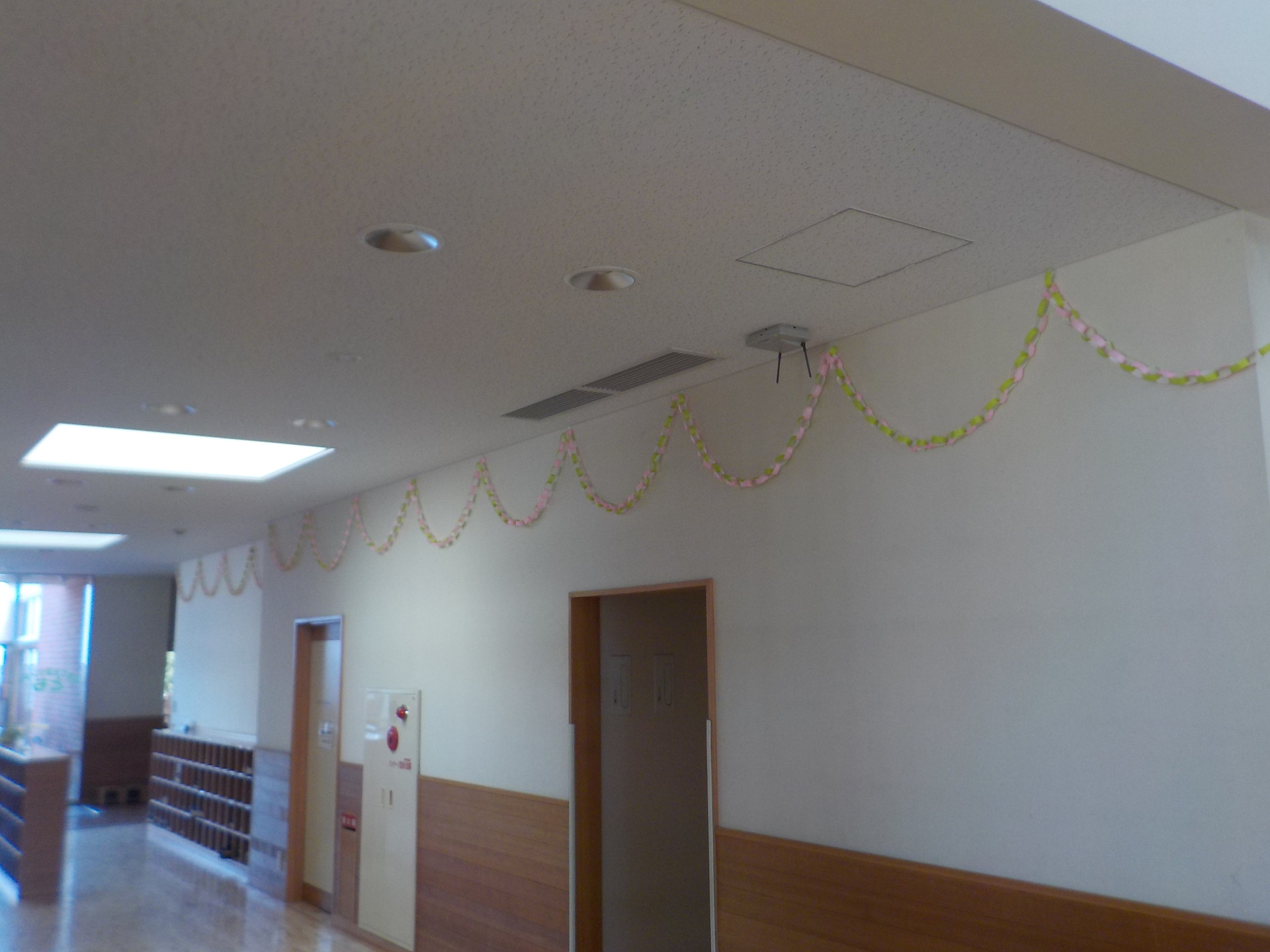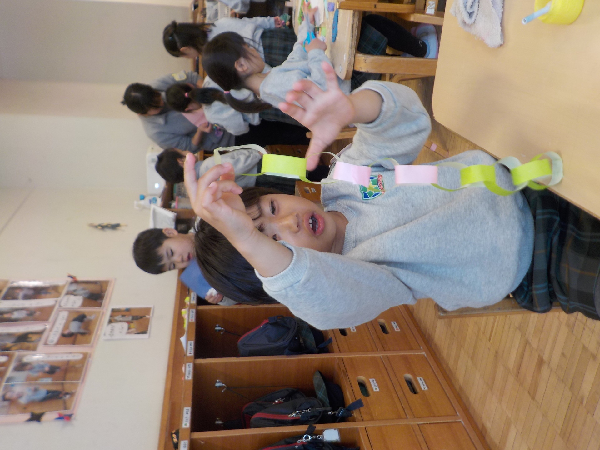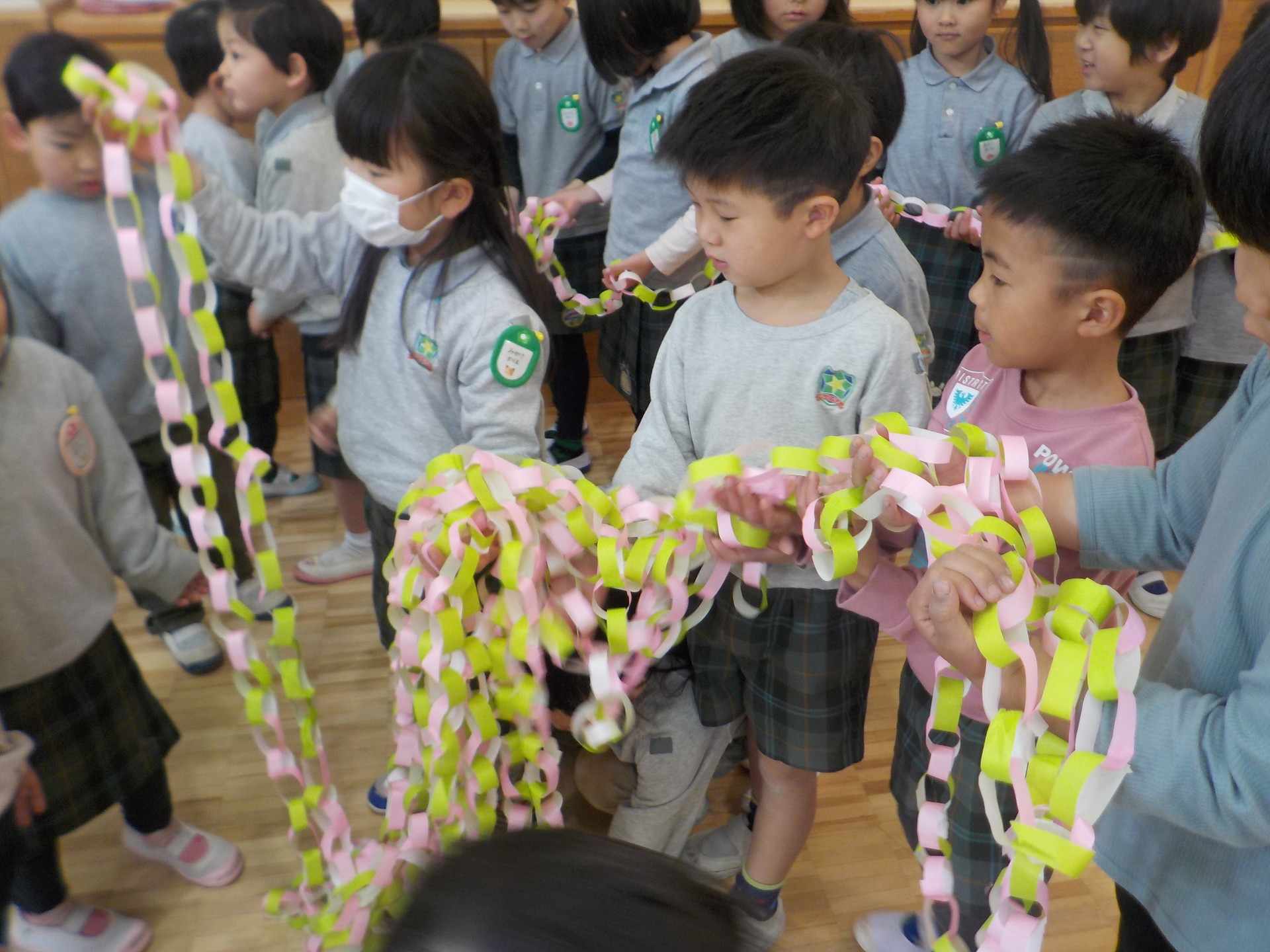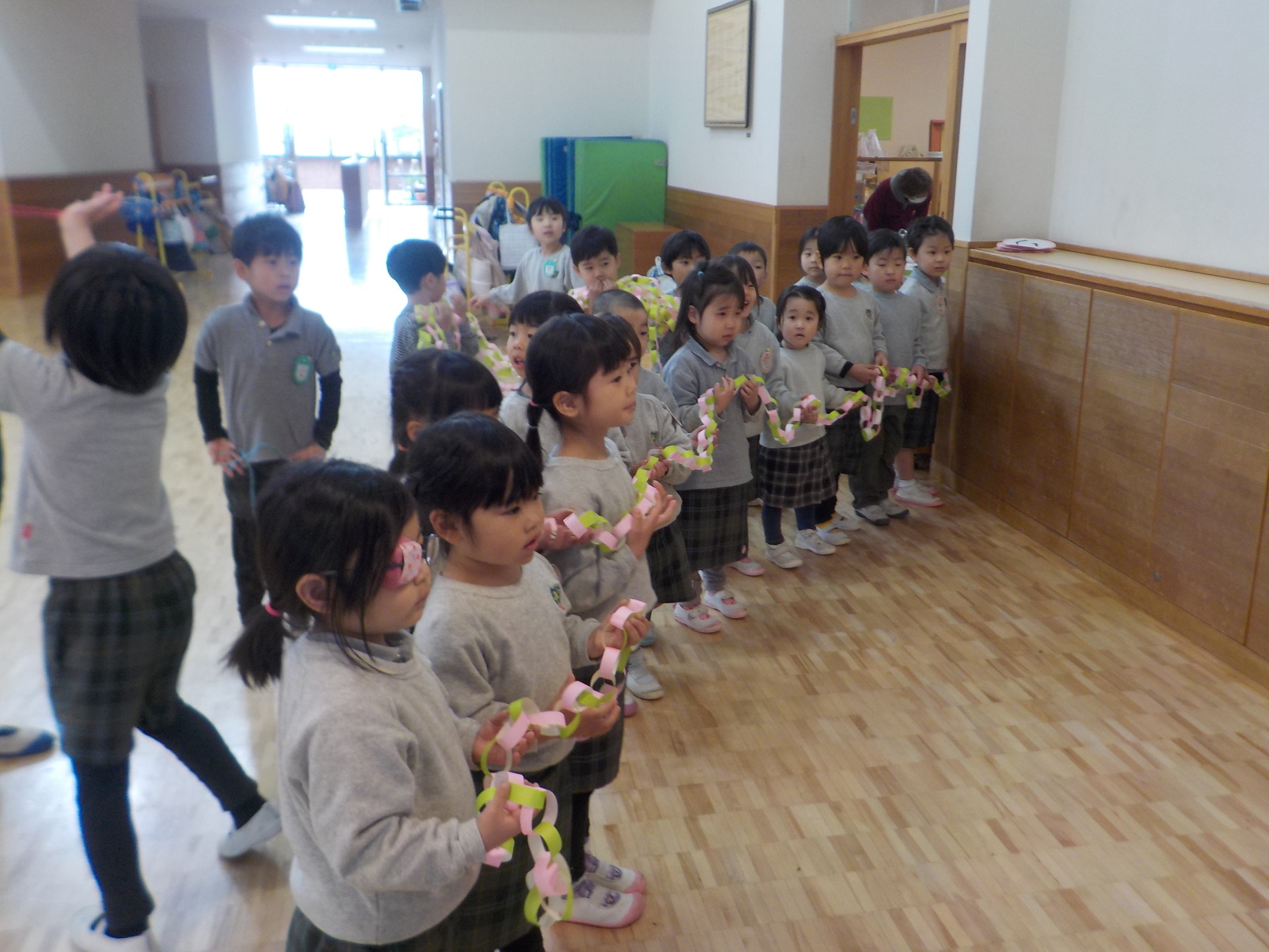皆で“長い一本の輪飾り”を作り、にじ組の保育室に向かいます。